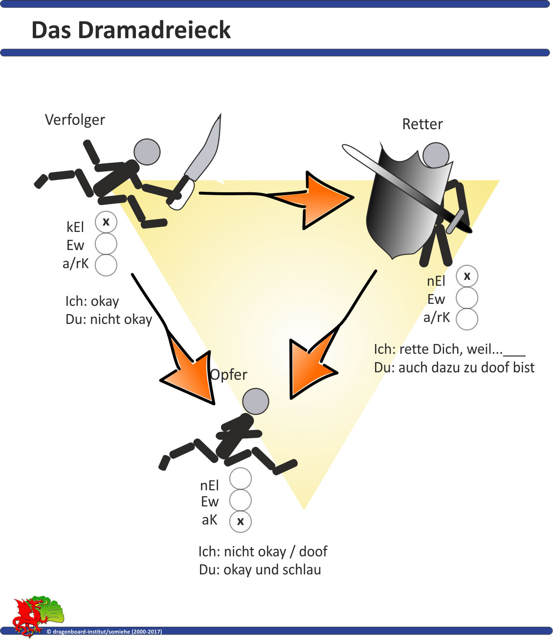 Diese Gruppe Menschen stellen die Verfolger im Dramadreieck., Sie „verfolgen“ andere - als Lehrer, Eltern, Vorgesetzte, bessere Autofahrer,... Sie lassen, wo immer es geht, diejenigen, die weniger mächtig als sie selbst sind, ihre scheinbare Überlegenheit spüren lassen. Sie spielen „Makel“ und sind damit beschäftigt, anderen immer zu zeigen, dass sie besser und die anderen schlechter sind. Sie mäkeln, kritisieren, grenzen aus und führen virtuelle oder tatsächliche Feldzüge gegen die, die aus ihrer Sicht nicht okay sind. Sie missachten das Lebens(gestaltungs)recht anderer und mischen sich ohne Auftrag in das Leben derjenigen, die sie für weniger kompetent halten, ein.